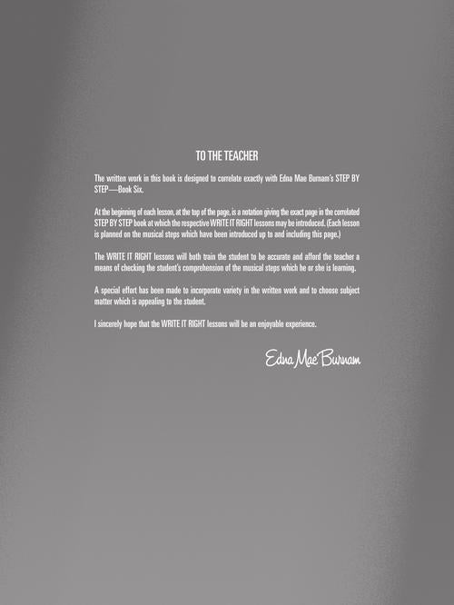 The Edna Mae Burnam Write It Right series is a valuable aid in creating well-rounded young musicians. The delightful lessons and exercises are designed to perfectly correlate with those in Burnam's popular Step by Step series, with specific page numbers linking lessons between the two so that concepts can be reinforced. Through the written exercises the student is able to better assimilate concepts learned in the piano lesson, and the teacher better able to gauge how much a student truly understands those concepts. Endearing classic illustrations add to the appeal of this time-tested series.