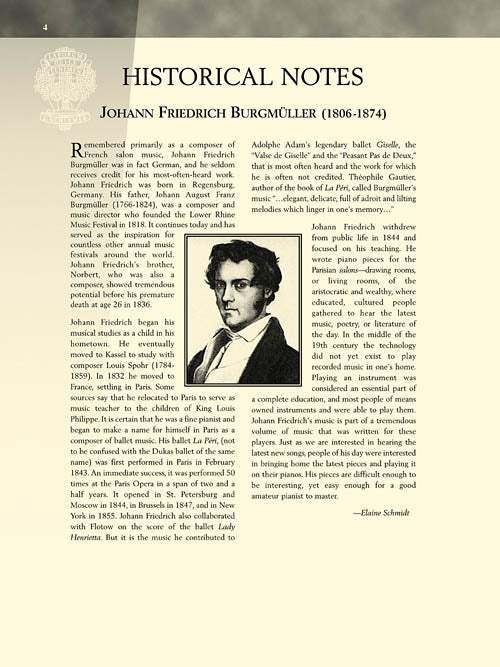Burgmüller - 25 Progressive Studies, Opus 100Publisher: G. Schirmer, Inc.Category: Educational KeyboardSeries: Schirmer Performance EditionsFormat: Softcover Audio OnlineJohann Friedrich Burgmüller (1806-1874) settled in Paris and his light and intimate playing style won popularity in the salons...Regular price $15.99 -
