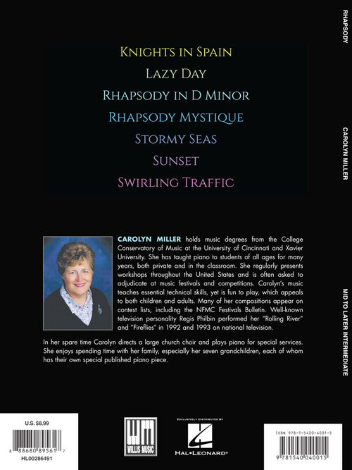 Rhapsody National Federation of Music Clubs 2020-2024 Selection Mid to Later Intermediate Publisher: Willis Music Category: Educational Keyboard Series: Willis Format: Softcover Seven impressive piano solos for the intermediate pianist! All the solos feature different moods...Regular price $16.99 -