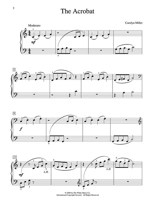 The Acrobat Mid-Elementary Level Publisher: Willis Music Category: Educational Keyboard Series: Willis Format: Paperback The Acrobat is an energetic piece that tumbles excitedly all over the keyboard. Great practice for drop-rolls (two-note slurs) and legato phrasing....Regular price $3.99 -