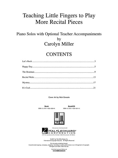 Teaching Little Fingers to Play More Recital Pieces Mid-Elementary Level Publisher: Willis Music Category: Educational Keyboard Series: Willis Format: Softcover Students will love playing these mid-elementary level supplements with fantastic optional teacher accompaniments. They complement and...Regular price $9.99 -