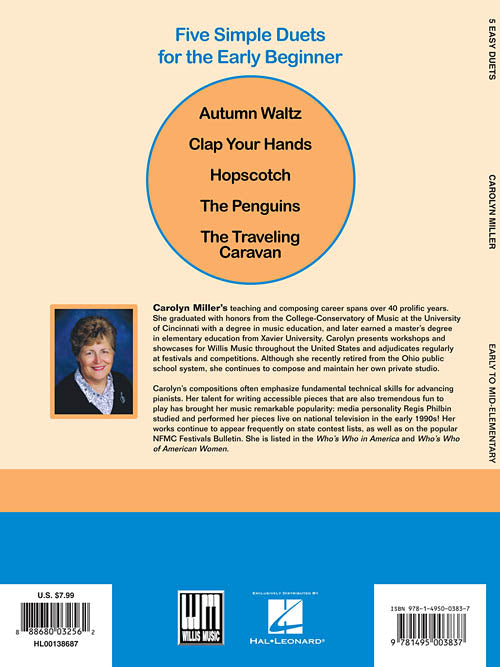 5 Easy Duets Early to Mid-Elementary Level Publisher: Willis Music Category: Educational Keyboard Series: Willis Format: Softcover Kids of all ages will love performing these simple, winning duets by Carolyn Miller! When young students perform collaboratively...Regular price $10.99 -