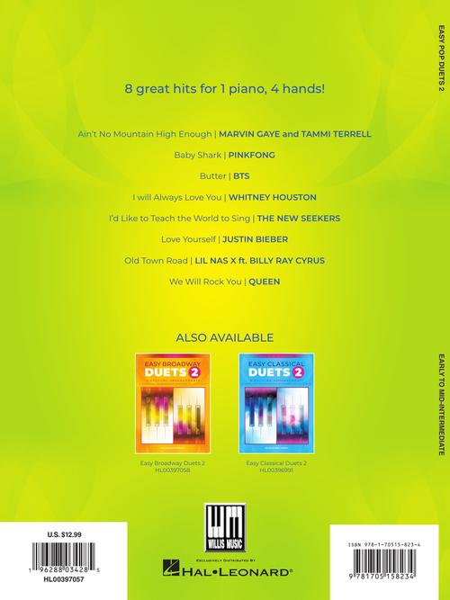 Easy Pop Duets 2 Publisher: Willis Music Category: Educational Keyboard Series: Willis Format: Softcover Eight great pop tunes arranged for one piano, four hands! Enjoy music-making with your best friend and sing out loud or repeat...Regular price $15.99 -