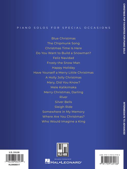 Christmas Pop Favorites for Piano Solo Intermediate to Early Advanced Level Publisher: Willis Music Category: Educational Keyboard Series: Willis Format: Softcover 18 beautiful piano solos of Christmas favorites for festive occasions, featuring a variety of stylized...Regular price $20.99 -