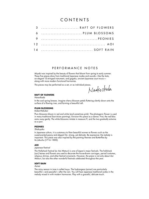 Miyabi 5 Japanese Impressions for Piano Solo Publisher: Willis Music Category: Educational Keyboard Series: Willis Format: Paperback This brief, beautiful collection was inspired by flowers that bloom in late spring and early summer. Miyabi is a...Regular price $11.99 -