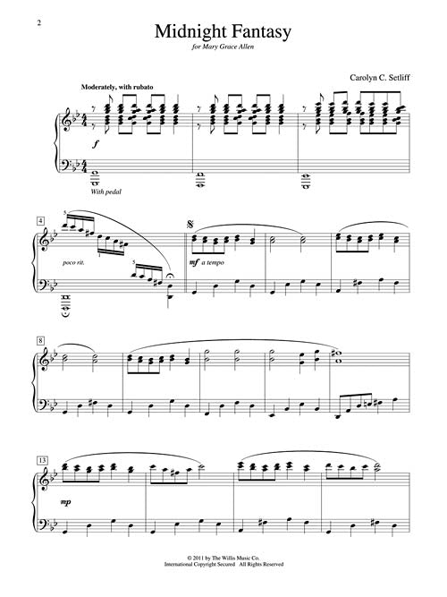 Midnight Fantasy Mid-Intermediate Level Publisher: Willis Music Category: Educational Keyboard Series: Willis Format: Paperback This lush, romantic piece has big, lovely harmonies, lots of hand-over-hand arpeggios, and a melody that will linger. Perfect for the student...Regular price $3.99