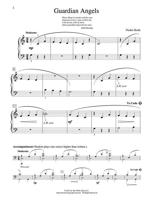 Guardian Angels Early Elementary Level Publisher: Willis Music Category: Educational Keyboard Series: Willis Format: Paperback This gentle, lyrical piece feels suspended in air. Four-measure phrases are instinctive. In mostly five-finger pattern; some hand-over-hand is included. Comes...Regular price $4.99 -