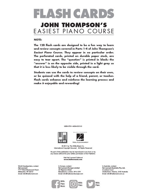 Flash Cards John Thompson's Easiest Piano Course Publisher: Willis Music Category: Educational Keyboard Series: Willis Format: Softcover Create an enhanced learning experience for beginning students of any age with these 128 musical flash cards! The 4...Regular price $20.99 -