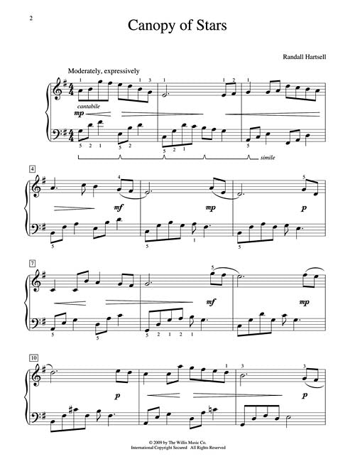 Canopy of Stars Early Intermediate Level Publisher: Willis Music Category: Educational Keyboard Series: Willis Format: Paperback An expressive two-page piece with an alluring melody, long phrase lines, and delicate sighs. In G Major, with pedal throughout....Regular price $3.99 -