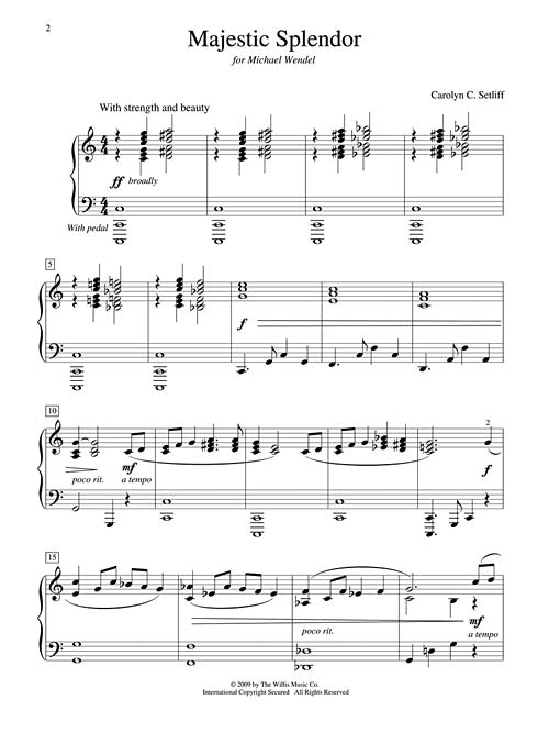 Majestic Splendor Early Intermediate Level Publisher: Willis Music Category: Educational Keyboard Series: Willis Format: Paperback Majestic Splendor is broad, sweeping, and inspiring. Using octaves, wide jumps, and a beautiful melody, Setliff makes excellent use of a...Regular price $5.99 -