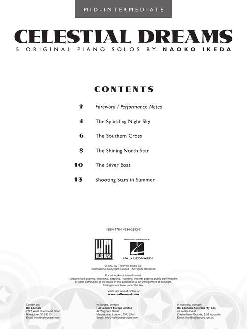 Celestial Dreams Mid-Intermediate Level Publisher: Willis Music Category: Educational Keyboard Series: Willis Format: Softcover Five captivating and hauntingly beautiful piano solos from Naoko Ikeda built on the premise of a midnight sky. Faraway dreams and romantic...Regular price $11.99
