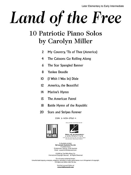 Land of the Free National Federation of Music Clubs 2020-2024 Selection Later Elementary to Early Intermediate Level Publisher: Willis Music Category: Educational Keyboard Series: Willis Format: Paperback 10 songs of American pride for developing pianists, including:...Regular price $11.99 -