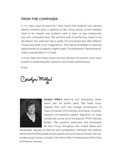 Piano Solos in Lyrical Style Early Intermediate Level Publisher: Willis Music Category: Educational Keyboard Series: Willis Format: Paperback Seven elegant originals that are sure to please students and audiences alike. Besides being great studies in voicing...Regular price $10.99 -