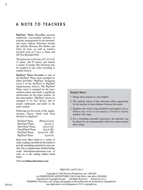 Arranger: Nancy FaberBigTime® Piano Favorites Level 4 Publisher: Faber Piano Adventures Category: Educational Keyboard Series: Faber Piano Adventures® Format: Softcover These traditional, ever-popular melodies are presented in pianistic arrangements for the intermediate piano student. The pieces...Regular price $8.99 -