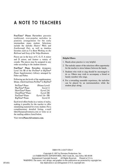 Arranger: Nancy FaberFunTime® Piano Favorites Level 3A-3B Publisher: Faber Piano Adventures Category: Educational Keyboard Series: Faber Piano Adventures® Format: Softcover Pianistic arrangements of ever-popular melodies for the early intermediate piano student. Pieces are in the keys...Regular price $9.99 -