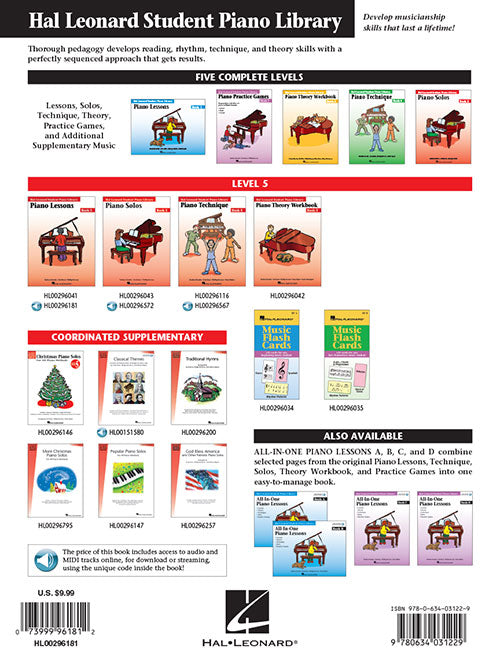 Piano Lessons Book 5Hal Leonard Student Piano LibraryPublisher: Hal LeonardCategory: Educational KeyboardSeries: Educational Piano LibraryFormat: Softcover Audio OnlineIn Piano Lessons Book 5, students are introduced to sixteenth notes in various rhythm patterns. The wide variety of...Regular price $15.99 -