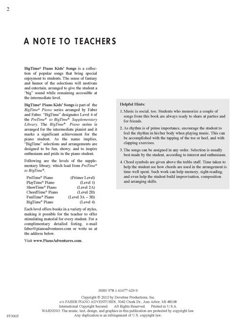 Arranger: Nancy Faber BigTime® Piano Kids' Songs Level 4 Publisher: Faber Piano Adventures Category: Educational Keyboard Series: Faber Piano Adventures® Format: Paperback Intermediate pianists will enjoy this fun-filled collection of favorite kids' songs, arranged to show...Regular price $10.99 -