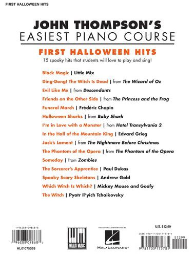 First Halloween Hits John Thompson's Easiest Piano Course Publisher: Willis Music Category: Educational Keyboard Series: Willis Format: Softcover 15 spooky pop and classical favorites that piano students will love to play and sing! Titles includes: Ding-Dong!...Regular price $15.99 -