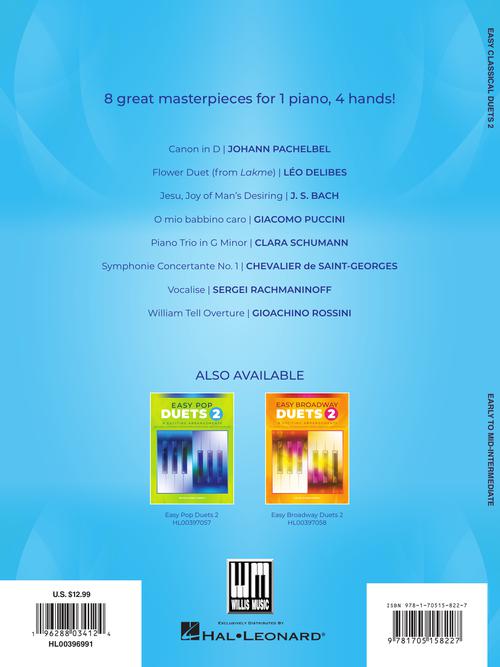Easy Classical Duets 2 Publisher: Willis Music Category: Educational Keyboard Series: Willis Format: Softcover Eight classical masterpieces arranged for one piano, four hands! Collaborative music-making often begins with duets between teacher and student but these equal-part...Regular price $15.99
