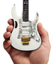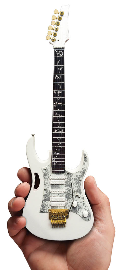 This collectible miniature guitar replica was hand-crafted in honor of the legendary guitarist Steve Vai. This signature White Jem model was used for many performances by Steve. This miniature captures The Tree of Life on the frets. The replica is simply a beautiful piece. Each Axe Heaven® miniature guitar replica guitar 1:4 scale and is individually handcrafted from solid wood, with metal tuning keys. Each guitar model is approximately 10 inch. in length and comes complete with a high-quality miniature adjustable A-frame stand and an Axe Heaven® guitar case box.