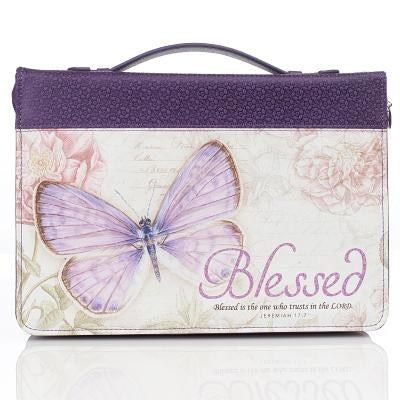 The Purple Botanic Butterfly Blessing Bible Cover features the artwork of Jane Shasky, with her fresh botanicals embellished with elegant calligraphy fashioned as a "carte postale" serving as a background for a signature purple butterfly. The Jane Shasky design is silk-screened on the coated front panel. The body of the cover is embossed with flowers. There is an exterior zipper with a cross engraved zipper-pull, a convenient lay-flat spine handle and 2 pen loops inside. All man-made materials. The Large size comfortably holds all popular Bibles such as The New Spirit-Filled Bible, The Life Application Study Bibles and the NIV Study Bible, as well as many other books and Bibles up to 9.50 x 6.75 x 2.25 inches.