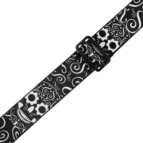 Features: · Levy's 2 inch. Calaca series poly strap with black and white skull print · Adjustable to 6 inch. · One-ply printed polyester guitar strap with leather ends. · Black plastic loop and slide hardware · Handcrafted in Nova Scotia, Canada · Pin hole stitching prevents stretching · Wrinkle-resistant material · Lightweight and easily rolled for compact storage