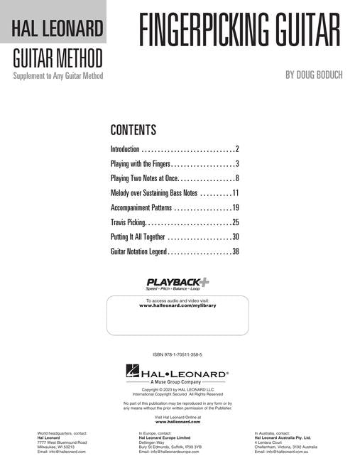 The Hal Leonard Guitar Method has been a mainstay for students of the guitar for many years. In this latest installment, the Hal Leonard Fingerpicking Guitar Method, guitarist Doug Boduch fast-tracks you through the fundamentals, utilizing familiar songs that are guaranteed to help you master this essential way of playing. Topics include how to play with the pick-hand fingers, playing multiple lines at once, accompaniment patterns, Travis picking, and much more! To help you achieve success in the best way possible, we've also included solo guitar audio and video demos of the author playing through the examples. Two dozen songs are featured, including: Africa · Blackbird · Dust in the Wind · Landslide · Rolling in the Deep · Shallow · and more!