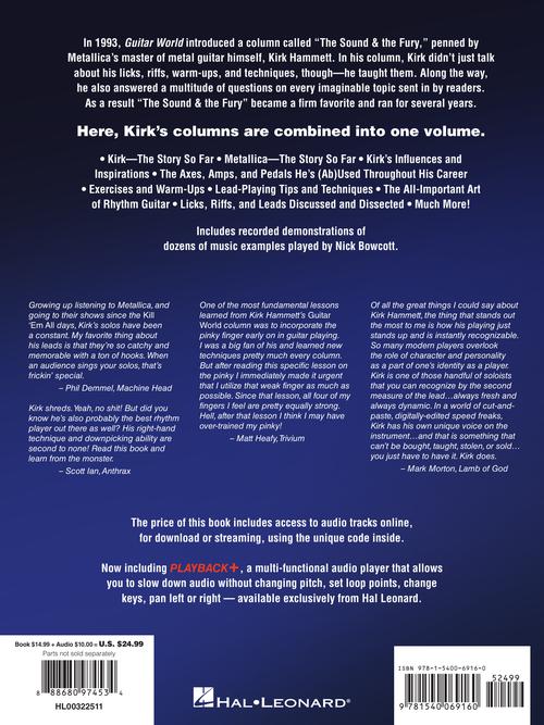 In 1993, Guitar World magazine introduced a column called The Sound & the Fury, penned by Metallica's master of metal guitar himself, Kirk Hammett. In his column, Kirk didn't just talk about his licks, riffs, warm-ups, and techniques, though - he taught them. Along the way, he also answered a multitude of questions on every imaginable topic sent in by readers. As a result, The Sound & the Fury became a firm favorite and ran for several years. This book combines Kirk's columns into one convenient volume. Topics include: Kirk - The Story So Far; Metallica - The Story So Far; Kirk's Influences and Inspirations; The Axes, Amps, and Pedals He's (Ab)Used Throughout His Career; Exercises and Warm-Ups; Lead-Playing Tips and Techniques; The All-Important Art of Rhythm Guitar; Licks, Riffs, and Leads Discussed and Dissected; and much more! This book also includes access to recorded demonstrations of dozens of music examples played by Nick Bowcott. Audio is accessed online using the unique code inside the book and can be streamed or downloaded. The audio files include PLAYBACK+, a multi-functional audio player that allows you to slow down audio without changing pitch, set loop points, change keys, and pan left or right.