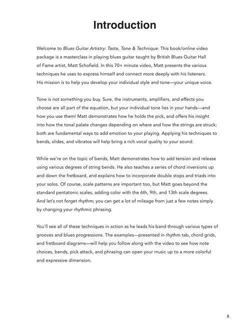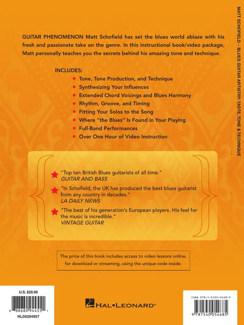 Guitar phenomenon Matt Schofield has set the blues world ablaze with his fresh and passionate take on the genre. In this instructional book/video package, Matt personally teaches you the secrets behind his amazing tone and technique. Includes: · Tone, tone production, and technique · Synthesizing your influences · Extended chord voicings and blues harmony · Rhythm, groove, and timing · Fitting your solos to the song · Where the blues is found in your playing · Full-band performances · Over one hour of video instruction. The price of this book includes access to video lessons online, for download or streaming, using the unique code inside each cover.