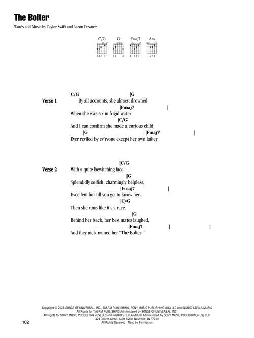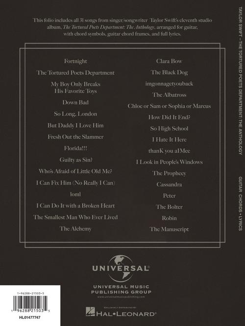 You've memorized all the songs from the double album, now it's time to play them for yourself! Our matching folio to The Tortured Poets Department: The Anthology features all 31 tracks meticulously arranged for guitar, with chord symbols, guitar chord frames, and full lyrics. Dive into the emotional depth of Swift's music and play along with your favorite tracks from "Fortnight" to "The Manuscript," to "So Long, London" to "So High School," and all the others. Immerse yourself in the storytelling prowess of Taylor Swift and bring her songs to life with your own unique voice and talent!