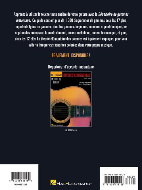 Author: Various Répertoire D'Gammes Instantané Guide facile à utiliser contenant plus de 1300 gammes de guitar Publisher: Hal Leonard Category: Guitar, Bass & Fretted Series: Guitar Method Format: Softcover Apprenez a utiliser le touche toute entiere...Regular price $9.99 -