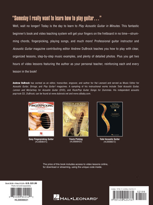 Author: Andrew DuBrock Play Acoustic Guitar in Minutes Publisher: Hal Leonard Category: Guitar, Bass & Fretted Series: Guitar Educational Format: Softcover Video Online This fantastic beginner's guide will get your fingers on the fretboard in no...Regular price $33.99 -