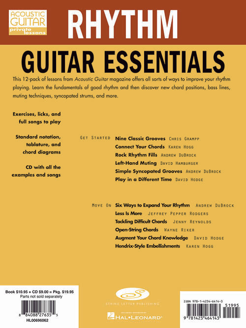 Author: Various Authors Rhythm Guitar Essentials Learn to Play Rock-Solid Rhythm and Expand Your Chord Vocabulary Publisher: String Letter Media Category: Guitar, Bass & Fretted Series: Guitar Educational Format: Softcover Audio Online Guitar Tab: YES This...Regular price $23.99 -