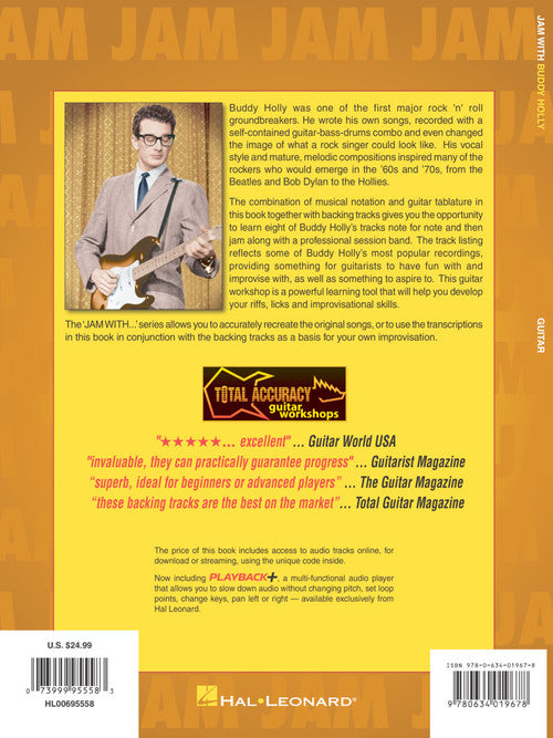 Artist: Buddy Holly Jam with Buddy Holly Publisher: Hal Leonard Category: Guitar, Bass & Fretted Series: Guitar Educational Format: Softcover Audio Online Guitar Tab: YES This book/online audio pack lets guitarists learn 8 great Buddy Holly...Regular price $31.99 -