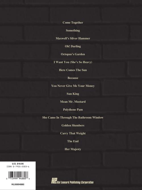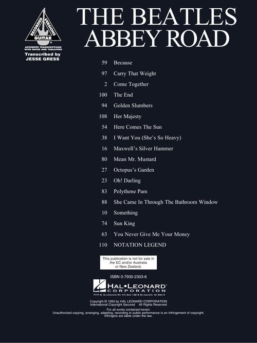 The Beatles - Abbey Road Publisher: Hal Leonard Category: Guitar, Bass & Fretted Series: Guitar Recorded Version Format: Paperback Guitar Tab: YES Matching folio to the classic album, including the songs: Come Together · Here Comes...Regular price $27.99 -