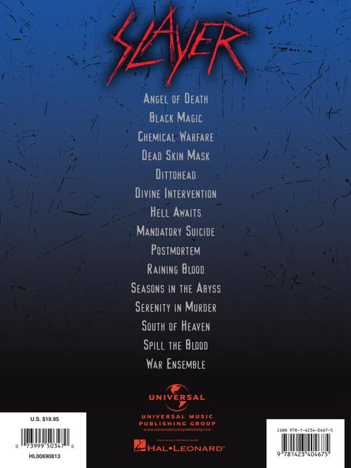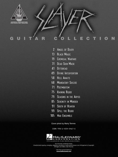 Slayer - Guitar Collection Publisher: Hal Leonard Category: Guitar, Bass & Fretted Series: Guitar Recorded Version Format: Softcover Guitar Tab: YES 15 megahits in notes and tab from throughout the illustrious career of these thrash metal...Regular price $32.99