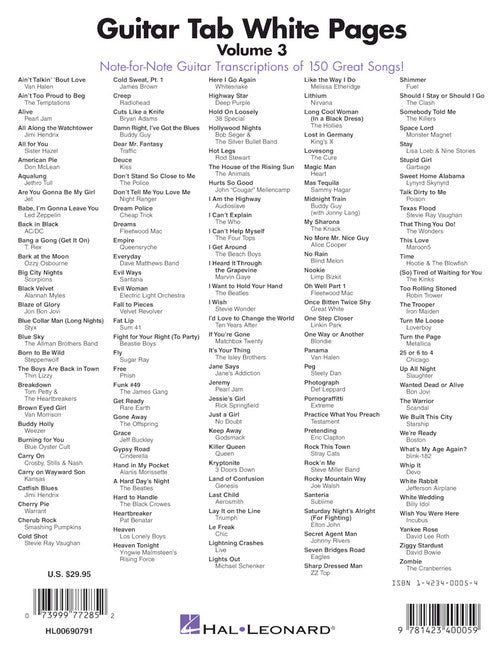 Guitar Tab White Pages Volume 3 Publisher: Hal Leonard Category: Guitar, Bass & Fretted Series: Guitar Recorded Version Format: Paperback Guitar Tab: YES By popular demand, here's Volume 3 of our best-selling guitar tab songbook featuring...Regular price $35.99 -