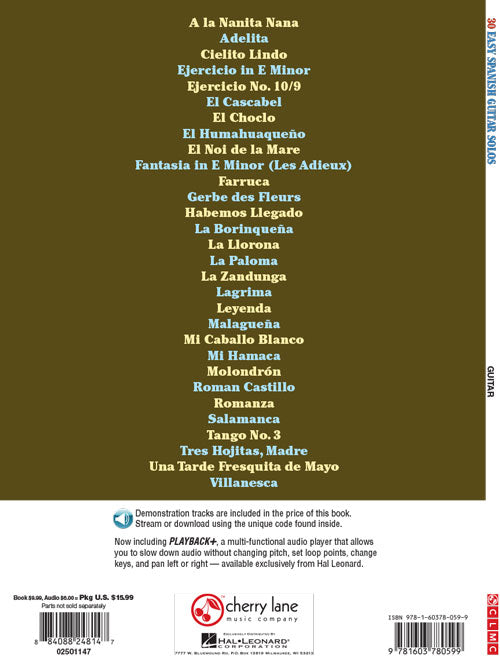 Easy arrangements with tab of favorites by Albeniz, Granados, Sor, Tarrega, and others. Includes: Cielito Lindo · Lagrima · Leyenda · Malagueña · La Paloma · Salamanca · and more. Also includes demonstration audio accessed online for download or streaming. Audio is accessed online using the unique code inside the book and can be streamed or downloaded. The audio files include PLAYBACK+, a multi-functional audio player that allows you to slow down audio without changing pitch, set loop points, change keys, and pan left or right.