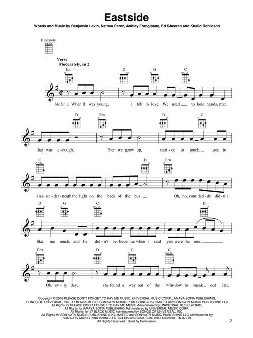 40 Most Streamed Songs for Ukulele Publisher: Hal Leonard Category: Guitar, Bass & Fretted Series: Ukulele Format: Softcover 40 top hits that sound great on uke! Includes: Despacito · Feel It Still · Girls like You · Happier · Havana · High Hopes · The Middle · Perfect · 7 Rings · Shallow · Shape of You · Something Just like This · Stay · Sucker · Sunflower · Sweet but Psycho · Thank U, Next · There's Nothing Holdin' Me Back · Without Me · and more! Listen to a Spotify playlist of all the songs from this book! (https://open.spotify.com/playlist/5m710n04sI6GBLsrAUmq9Y) Inventory # : 00298113 UPC: 888680950828 ISBN: 1540057569 Width: 9" Length: 12" Height: 0.49" Product Weight: 1.4 lbs. Number of Pages: 186