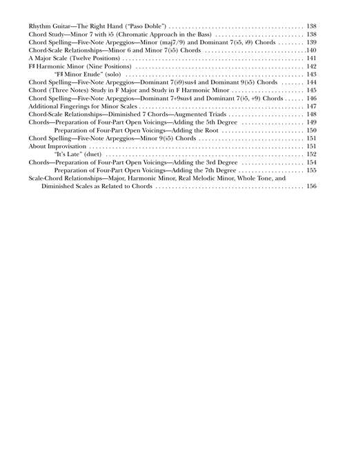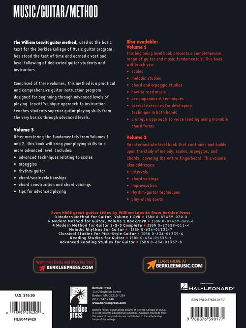 Leavitt's practical, comprehensive method is used as the basic text for Berklee's guitar program. After mastering the fundamentals from Volumes 1 and 2, guitarists will be ready to take their skills to a more challenging level. This book teaches: techniques relating to scales, arpeggios, rhythm guitar, chord/scale relationships, chord construction and voicings, tips for advanced playing, and more.