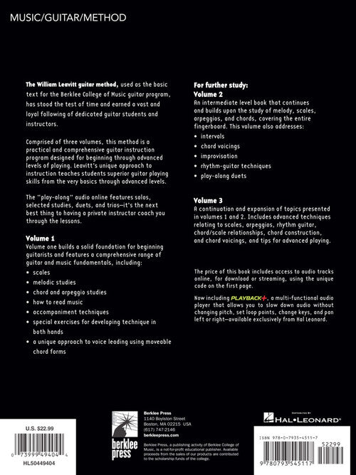 This practical, comprehensive method is used as the basic text for the guitar program at the Berklee College of Music. Volume One builds a solid foundation for beginning guitarists and features a comprehensive range of guitar and music fundamentals, including: scales, melodic studies, chord and arpeggio studies, how to read music, special exercises for developing technique in both hands, voice leading using moveable chord forms, and more. Book includes access to online recordings of the exercises.