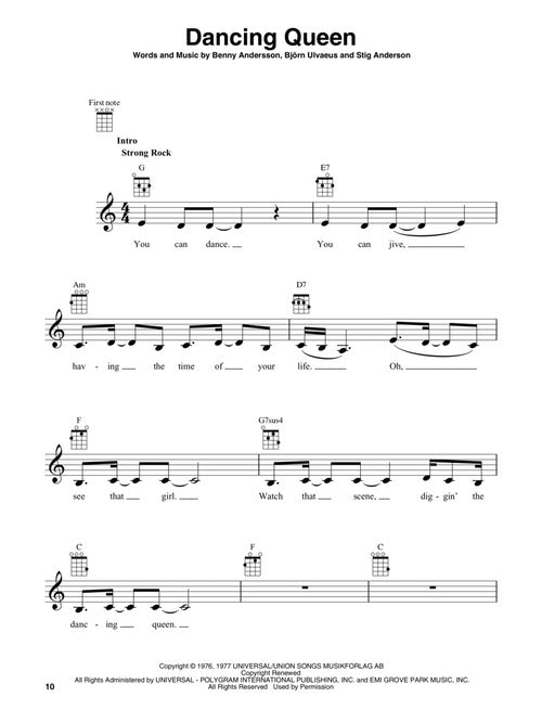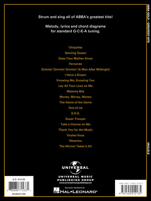Strum & sing all of ABBA's greatest hits on the uke with this collection of melody, lyrics and chord diagrams for standard G-C-E-A tuning. Includes: Chiquitita · Dancing Queen · Fernando · Gimme! Gimme! Gimme! (A Man After Midnight) · I Have a Dream · Lay All Your Love on Me · Mamma Mia · Money, Money, Money · S.O.S. · Take a Chance on Me · Thank You for the Music · Waterloo · and more.