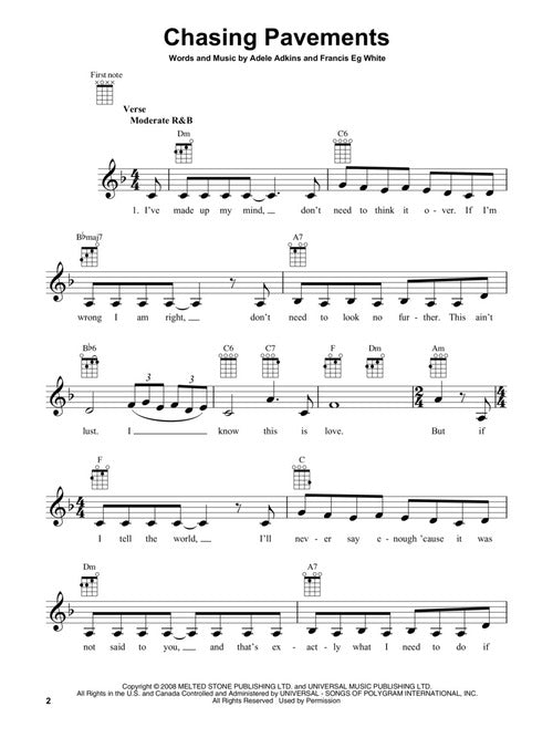 A dozen hits from this popular British diva for uke, including: Chasing Pavements · Hello · Lovesong · Make You Feel My Love · Rolling in the Deep · Rumour Has It · Send My Love (To Your New Lover) · Set Fire to the Rain · Skyfall · Someone like You · Water Under the Bridge · When We Were Young.