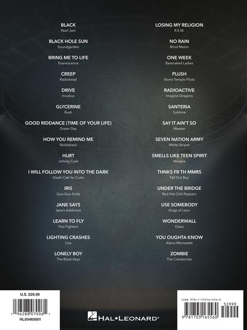 This collection features 30 classics that defined the soundtrack of a generation transcribed in notes and tab with lyrics. Songs include: Black Hole Sun · Creep · Glycerine · Good Riddance (Time of Your Life) · Hurt · Iris · Jane Says · Learn to Fly · Lightning Crashes · Losing My Religion · Radioactive · Santeria · Seven Nation Army · Smells like Teen Spirit · Thnks Fr Th Mmrs · Under the Bridge · Use Somebody · Wonderwall · You Oughta Know · Zombie · and more!