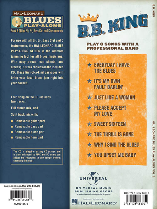 For use with all Bb, Eb, Bass Clef, and C instruments, the Hal Leonard Blues Play-Along Series is the ultimate jamming tool for all blues musicians. With authentic, easy-to-read lead sheets, and other split-track choices on the included CD, these first-of-a-kind packages will bring your local blues jam right into your house! Each professionally recorded song on the CD includes two tracks: a full-stereo mix, and a split track mix with removable guitar, bass, piano, and horn parts. The CD is playable on any CD palyer, and also enhanced so Mac & PC users can adjust the recording to any tempo without changing the pitch! Features 8 songs by the legendary B.B. King: Everyday I Have the Blues · It's My Own Fault Darlin' · Just like a Woman · Please Accept My Love · Sweet Sixteen · The Thrill Is Gone · Why I Sing the Blues · You Upset Me Baby.