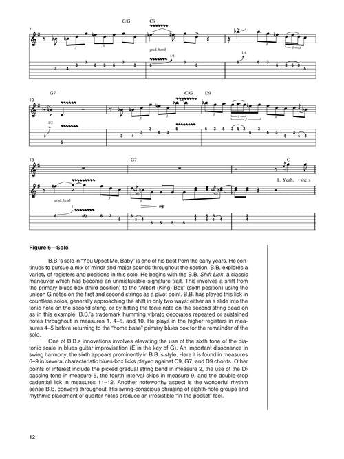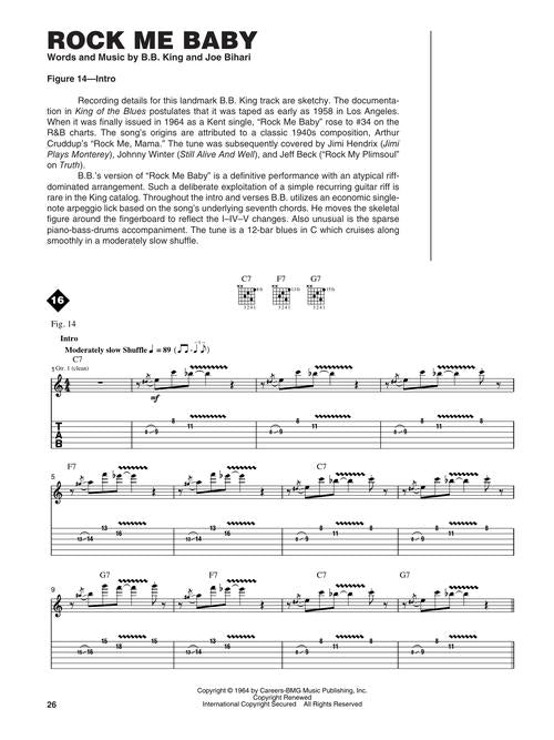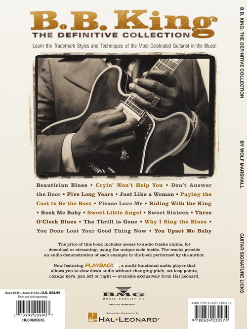 Learn the trademark styles and techniques of the most celebrated guitarist in blues! This book/online audio pack by Wolf Marshall is a breakdown of B.B. King's guitar style, sound and techniques, with a brief history and lessons for each piece. Covers 16 signature blues tunes, including: Beautician Blues · Five Long Years · Just Like a Woman · Riding with the King · Rock Me Baby · Sweet Sixteen · Three O'Clock Blues · The Thrill Is Gone · Why I Sing the Blues · You Upset Me Baby · and more! Audio is accessed online using the unique code inside the book and can be streamed or downloaded. The audio files include PLAYBACK+, a multi-functional audio player that allows you to slow down audio without changing pitch, set loop points, change keys, and pan left or right.