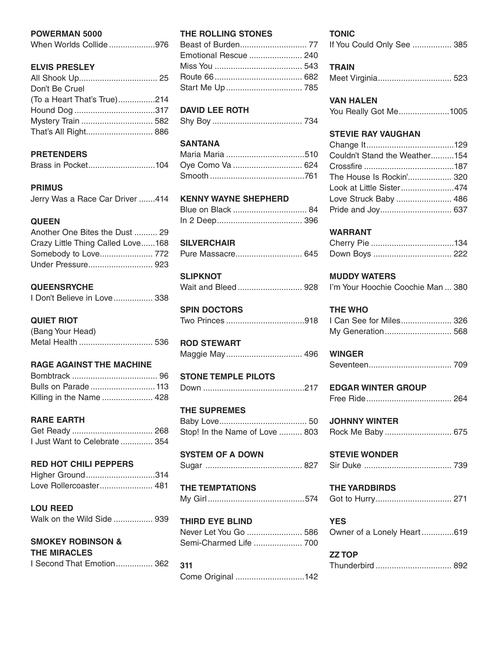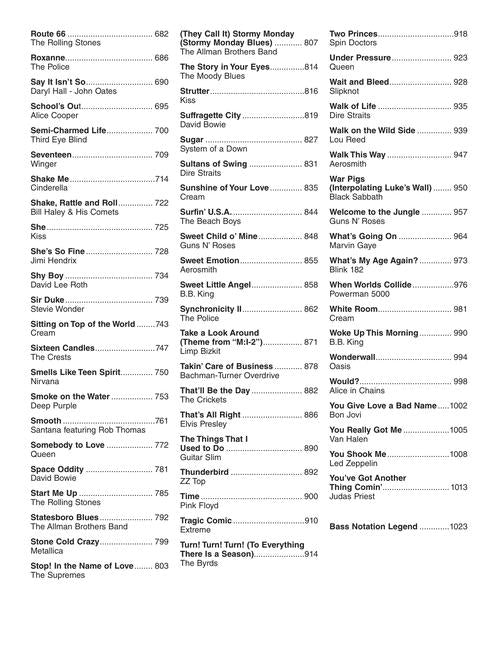 A must-have for any bass player! This outstanding 200-song collection features note-for-note bass transcriptions with tab, straight from the original recordings. All styles of music are represented in this massive, 1024-page compilation. Includes: All Apologies · All Shook Up · Another One Bites the Dust · Are You Gonna Go My Way · Baby Love · Bad Medicine · Badge · Barracuda · Beast of Burden · Blue on Black · Blue Suede Shoes · Blueberry Hill · Brass in Pocket · Bulls on Parade · Carry on Wayward Son · Cherry Pie · Come Out and Play · Come to My Window · Come Together · Couldn't Stand the Weather · Detroit Rock City · Eight Days a Week · Fly Away · Free Ride · Get Ready · Great Balls of Fire · Hard to Handle · Hey Joe · Hey Man Nice Shot · Higher Ground · I Can See for Miles · I Fought the Law · The Impression That I Get · Into the Great Wide Open · Iris · Iron Man · Jessica · Learn to Fly · Maggie May · Maria Maria · Money · My Girl · Oye Como Va · Paperback Writer · Paranoid · Pride and Joy · Riding with the King · Semi-Charmed Life · Sultans of Swing · Under Pressure · Walk of Life · Would? · Wonderwall · and many more!