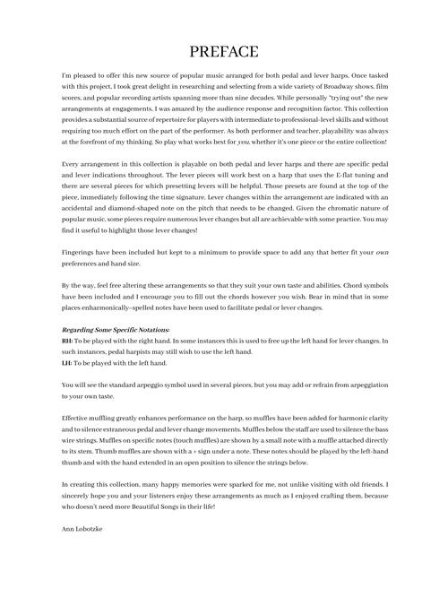 Meticulously curated, Beautiful songs for Harp features 28 timeless melodies, thoughtfully arranged for harpists of all levels. Suitable for both pedal and lever harps, this new collection is perfect for harpists looking to enhance their current repertoire. Songs include: And I Love Her · Bless the Broken Road · Bring Him Home · Can't Help Falling in Love · For All We Know · God Only Knows · Hallelujah · I Will Always Love You · If Ever I Would Leave You · Mia & Sebastian's Theme · Morning Has Broken · On the Street Where You Live · The Rainbow Connection · The Sound of Silence · You've Got a Friend · and more.