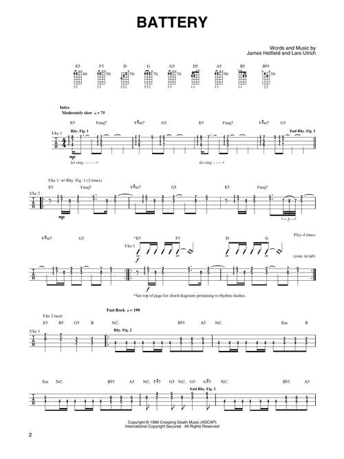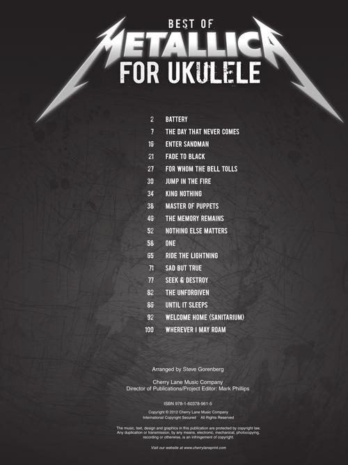 Admit it: you've often wished you had your ukulele handy when your favorite Metallica song popped in your head. Now there's no excuse not to bring the uke out and put those strings to the test! This folio features 18 of their best arranged specifically for uke, including: Enter Sandman · Fade to Black · For Whom the Bell Tolls · Master of Puppets · The Memory Remains · Nothing Else Matters · One · Ride the Lightning · Seek & Destroy · The Unforgiven · Until It Sleeps · Welcome Home (Sanitarium) · and more!