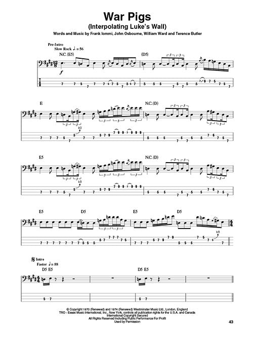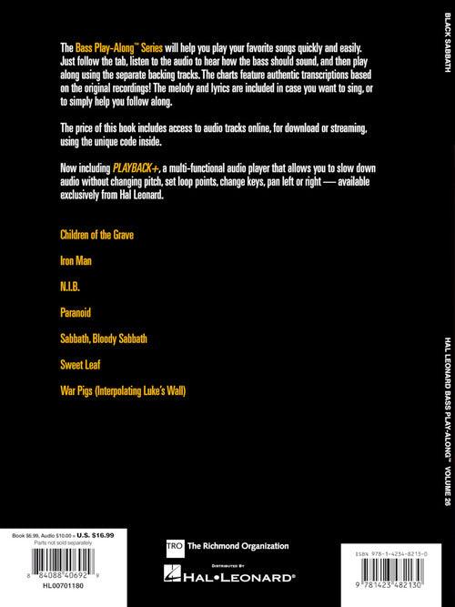 The Bass Play-Along series will help you play your favorite songs quickly and easily! Just follow the tab, listen to the audio tracks to hear how the bass should sound, and then play along using the separate backing tracks. The melody and lyrics are included in the book in case you want to sing, or to simply help you follow along. The audio is accessed online using the unique code inside each book and can be streamed or downloaded. The audio files include PLAYBACK+, a multi-functional audio player that allows you to slow down audio without changing pitch, set loop points, change keys, and pan left or right. This pack includes: Children of the Grave · Iron Man · N.I.B. · Paranoid · Sabbath, Bloody Sabbath · Sweet Leaf · War Pigs (Interpolating Luke's Wall).